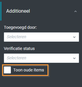 Om deze items weer naar voren te halen, kan je het vinkje "Toon oude items" aanzetten in het filter menu (veelal getoond onder het kopje 'Additioneel').