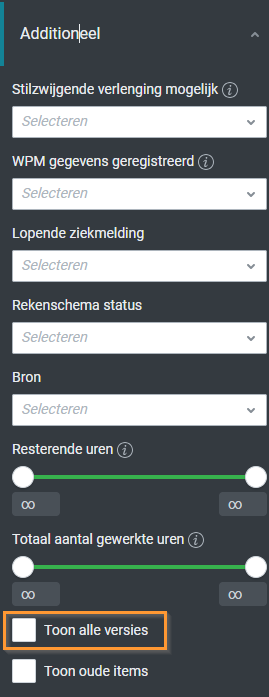 Bij contracten en declaraties is er nog een extra detail om rekening mee te houden. Hier wordt namelijk standaard altijd de meest recente versie getoond. Om alle versies in de lijstpagina te tonen kan je het vinkje "Toon alle versies" aanzetten (getoond onder het kopje 'Additioneel').
