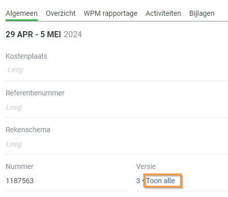 Heb je de declaratie zelf open? Dan vind je op het tabblad Algemeen de versie die je op dat moment bekijkt en de mogelijkheid om alle versies te bekijken: