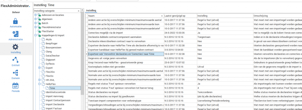 - Instelling in FS Administrator - koppelingen & import - HelloFlex Time staat op "nee". Zie onderstaand: