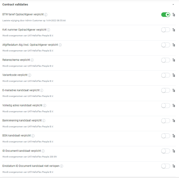 Op het niveau van 'Bureau' en 'Opdrachtgever' is een sectie beschikbaar voor 'Contract validaties', waarmee aangegeven kan worden welke gegevens verplicht moeten worden 'gevalideerd'. De validaties die beschikbaar zijn op het niveau van 'Opdrachtgever' worden standaard overerft van het 'Bureau' en het is mogelijk om hiervan af te wijken. Aanvullend is er logica beschikbaar gesteld om validaties voor de kandidaat verder te specificeren op basis van de 'Kandidaat soort'.