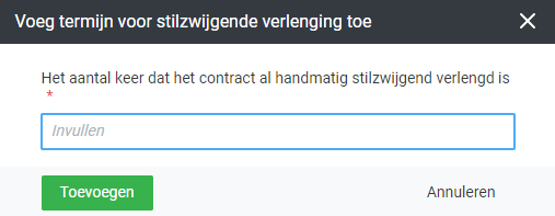 - Wanneer een contract nog niet eerder is verlengd, krijg je de optie om eerst het termijn in te voeren. Hiermee geef je aan of het contract al eens eerder handmatig (dus buiten HelloFlex om) is verlengd. Is dit niet het geval, voer hier dan het getal '0' in.
