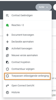 - Wanneer er nu een contract aangemaakt wordt en actief is met dit tekstmodel, zal je zien dat er onder de actieknop van het contract de mogelijkheid om stilzwijgend te verlengen is toegevoegd: