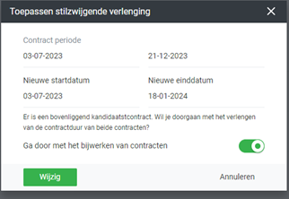 - Als je deze optie aanklikt volgt er een modelvenster met de bevestiging wat de nieuwe einddatum is en of je een eventueel gekoppeld kandidaatscontract ook wilt wijzigen: