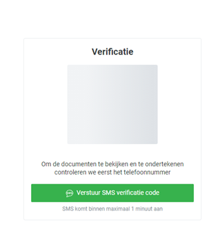 Bij het openen van de link, wordt eerst gevraagd om een verificatie. Door op de groene knop ‘Verstuur SMS verificatie code’ te drukken, wordt er automatisch een sms-bericht met een code verstuurd naar jouw mobiele nummer.