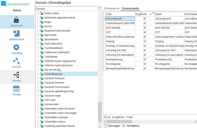 In HelloFlex via het Menu Admin Domein waarden Uitzendingwijze is te zien welke uitzendingwijzen aanwezig zijn en welke in gebruik zijn.