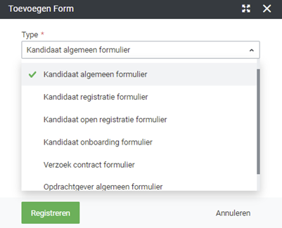 wordt gebruikt in module Kandidaat om een kandidaat via de Actie-knop rechtsboven in te schrijven via de optie 'Nodig kandidaat uit zich in te schrijven (Form)'. - Kandidaat, open registratieformulier;
