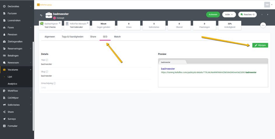 Met HelloFlex Talent Management beschik je automatisch ook over HelloFlex SEO. Om SEO te gebruiken open je de vacature die beter zichtbaar moet worden in een zoekmachine. Klik op het tabblad ‘SEO’ en je ziet dat een aantal velden Onder ‘Details’) al automatisch zijn ingevuld.