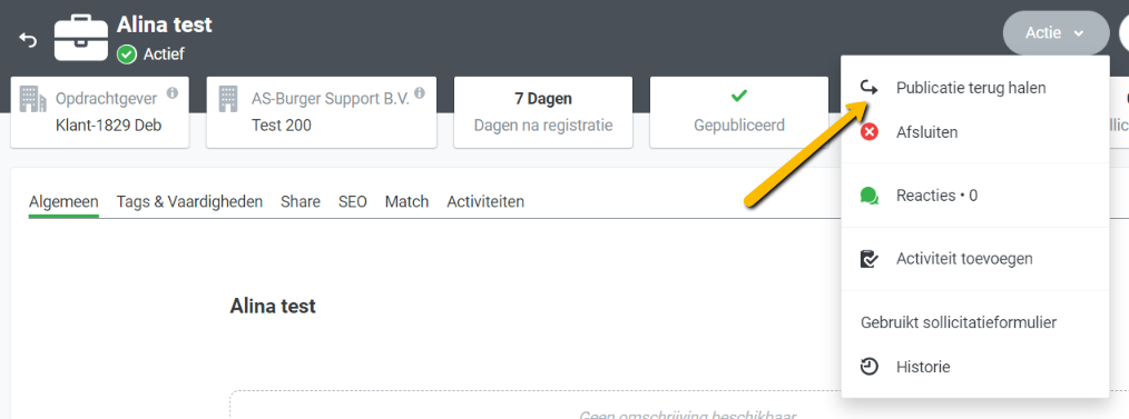 Door in HelloFlex bij vacature te kiezen voor “Publicatie terug halen” en vervolgens “Publiceren” te kiezen, krijgt deze weer de status nieuw op de vacaturepagina.