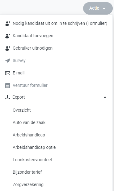 Daarnaast is het mogelijk om naar een geselecteerd aantal kandidaten een e-mail te verzenden, of een export te draaien. Bekijk dit artikel voor meer uitleg over de mogelijke acties op de kandidaat lijstpagina.
