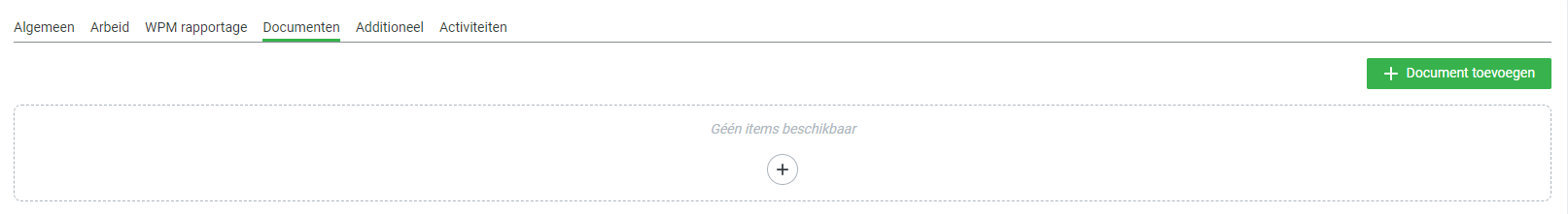 Op het tabblad Documenten in het contract kan je middels de groene knop of het plusje een document toevoegen.