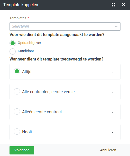 Op het tabblad Templates kan je een Document Template koppelen en bepalen wanneer dit document genereerd moet worden (vouw de opties open voor meer uitleg):