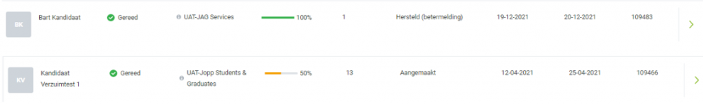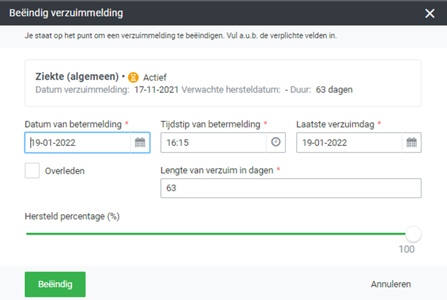 Het hersteld percentage staat standaard op een geheel herstel (100%), maar het is ook mogelijk om een gedeeltelijke herstel-melding op te geven, naar gelang het percentage dat de kandidaat weer arbeidsgeschikt is.