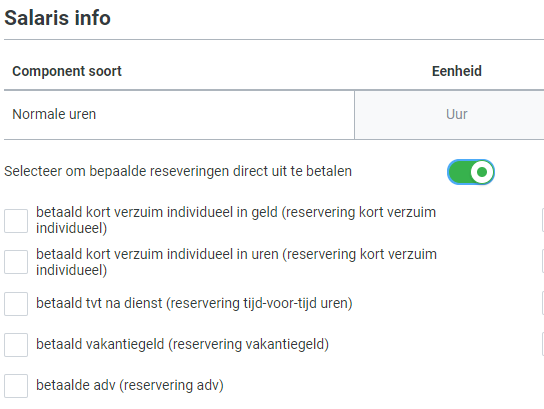 In de pro forma bij salarisinformatie, onder het invoeren van de componentensoorten, kan worden aangegeven of er opgebouwde reserveringen moeten worden uitbetaald middels het vinkje en er kan worden aangevinkt welke reserveringen hiervoor in aanmerking komen.