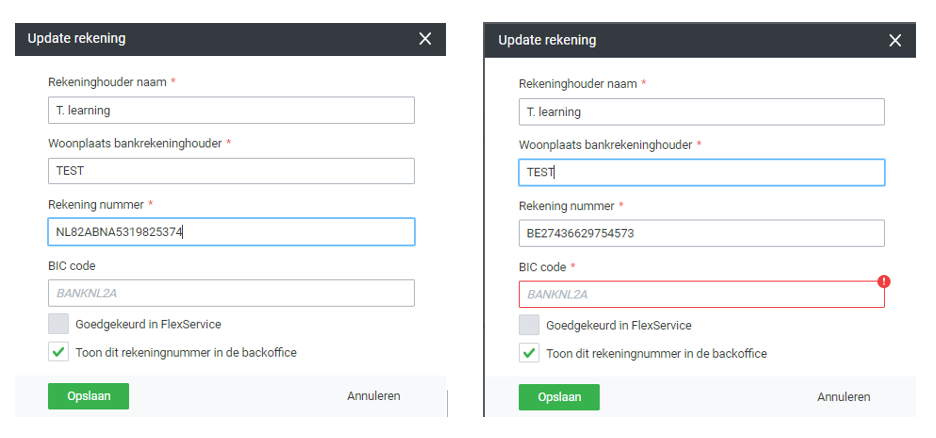 Als er een IBAN wordt ingevuld dat niet begint met 'NL' (een buitenlands nummer dus) dan wordt de BIC code automatisch verplicht (dynamisch veld). Bij een Nederlands IBAN is een BIC code niet vereist en wordt het veld dus ook niet verplicht om in te vullen.