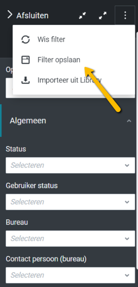 Open het 'filter'-menu en klik op Admin, stel het filter in waar je de alert op wilt hebben. Klik vervolgens op het menu (3 puntjes) en sla het filter op. Vul hier zoals gewenst de naam, omschrijving en eventuele andere instellingen in.