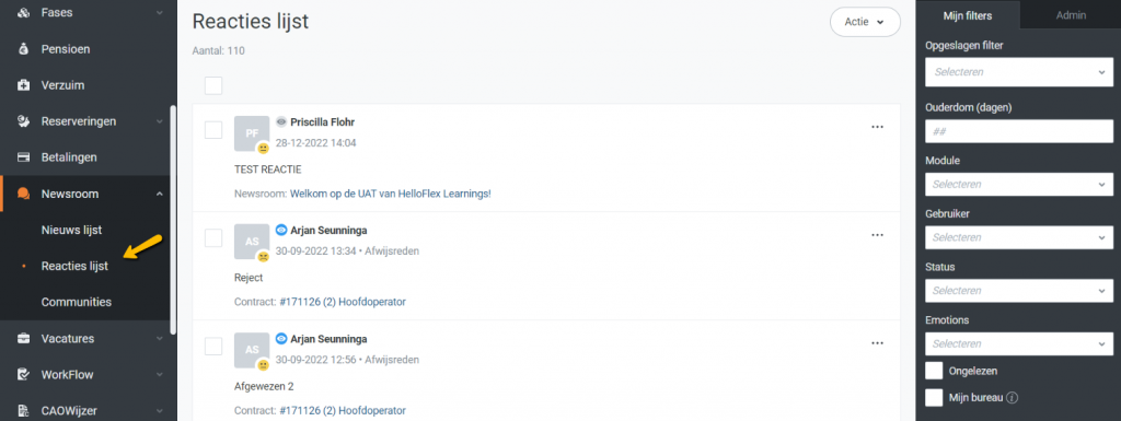 In het nieuwsbericht zelf vind je de reacties bij dat nieuwsbericht. Alle reacties in 1 keer inzien? Ga dan naar de lijstpagina Reacties. Deze vind je via Menu Gebruiker Newsroom Reacties lijst: