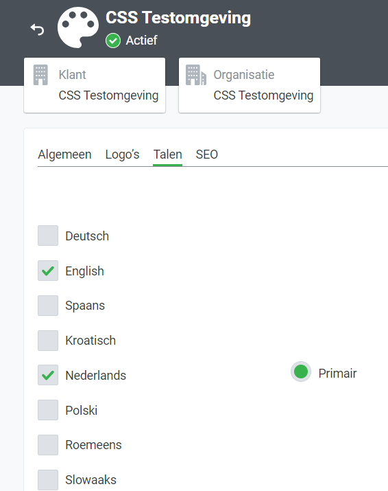 Per 'Label' kan ingesteld worden in welke talen het label beschikbaar is en kan een primaire taal ingesteld worden. Ga hiervoor (als Customer Admin) naar Admin/Label en vervolgens naar het tabblad : Talen":