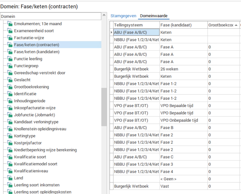 In de FlexAdministrator -> Domein -> Fase/Keten (Contracten) -> Domeinwaarden, zijn geen Grootboekcodes ingevuld in de kolom Grootboekcode. Vul hier een waarde in: