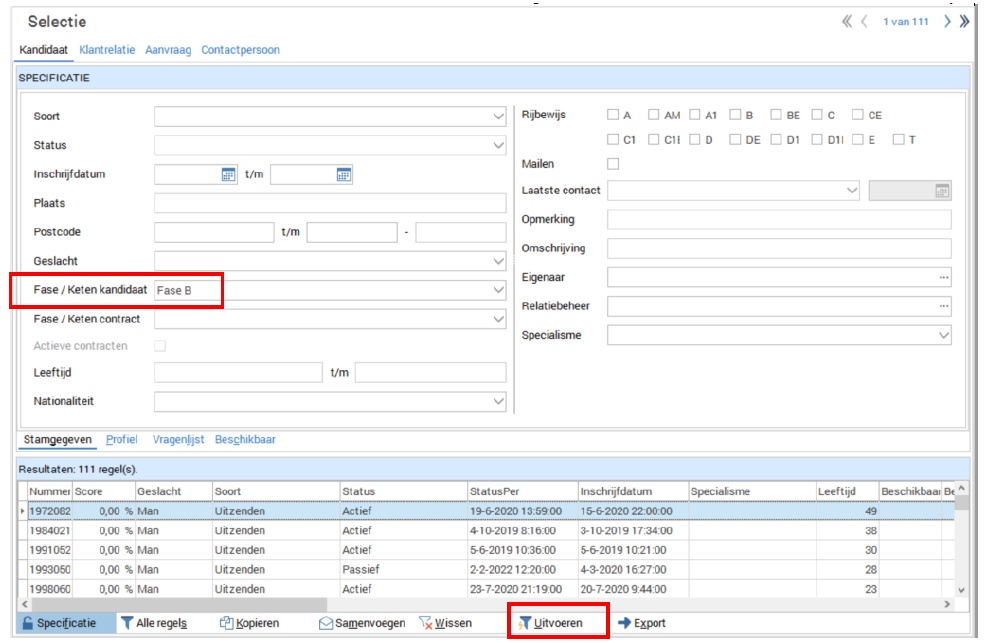 In module Selectie, tab Kandidaat haal je eerst de fase B kandidaten op.