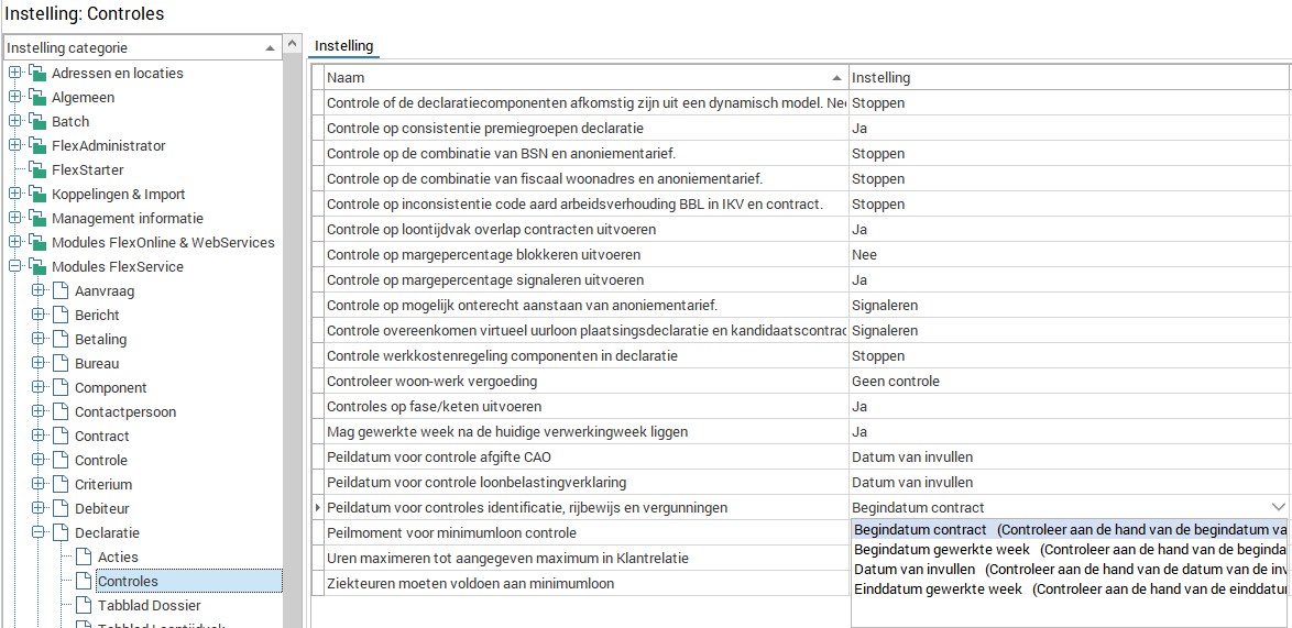 Zie Instellingen -> Modules FlexService -> Declaratie -> Controles.