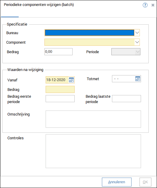 In het bovenste deel van het scherm dient er gekozen te worden welk bureau en component moet worden gewijzigd, in het vak Specificatie. Optioneel kan hier ook een bedrag worden ingevoerd. Dit bedrag wordt meegenomen in de selectie van de periodieke componenten en alleen de componenten die aan de 3 criteria voldoen zullen worden gewijzigd. Is de waarde in Bedrag leeg of 0,00, dan worden alle KandidaatComponenten voor het gekozen Componentsoort en Bureau in de wijziging opgenomen.