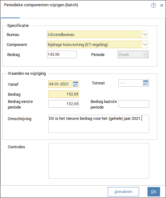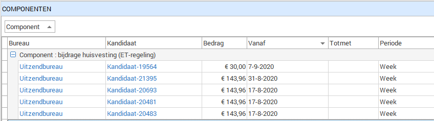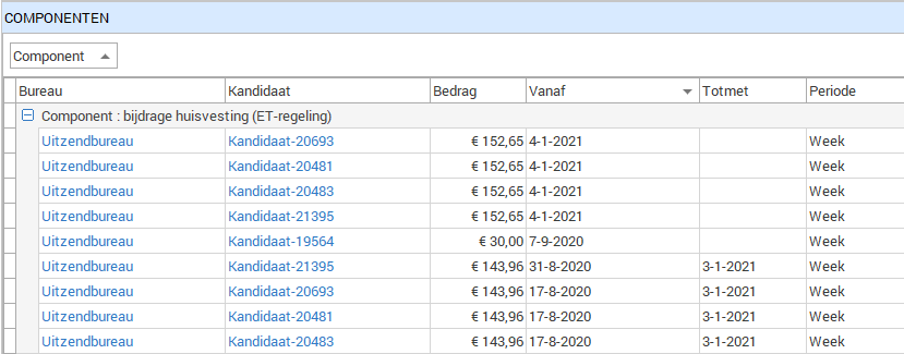 1. We gaan de component ‘bijdrage huisvesting (ET-regeling)’ bij bureau ‘Uitzendbureau’ wijzigen voor de kandidaten bij wie op dit moment een bedrag van €143,96 geldt. We verhogen dit bedrag naar €152,65 en deze zal ingaan per 04-01-2021 en geen einddatum bevatten.