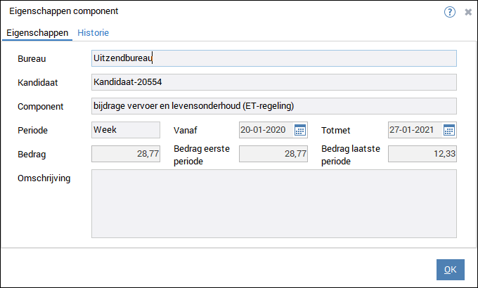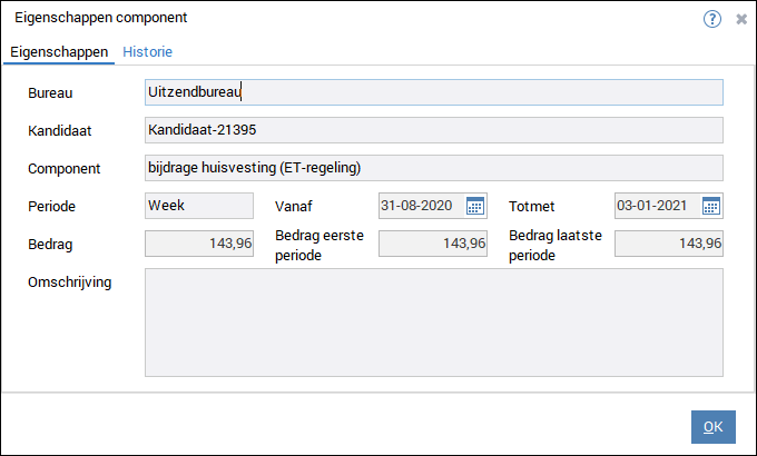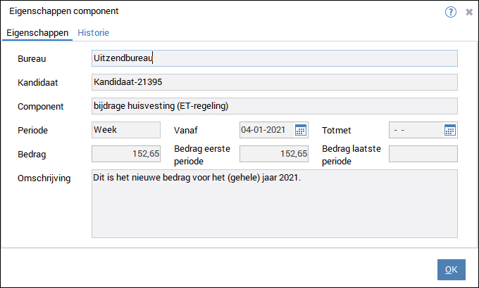 Vervolgens wordt er een nieuw KandidaatComponent aangemaakt die geldig zal zijn vanaf de Vanaf datum met het nieuwe bedrag. Het eerder in het scherm berekende bedrag voor de eerste (en indien aanwezig, de laatste) periode en eventueel de Omschrijving worden hierin ingevuld. De Omschrijving van de net afgesloten periodieke component wordt ook in dit nieuwe periodieke component overgenomen.