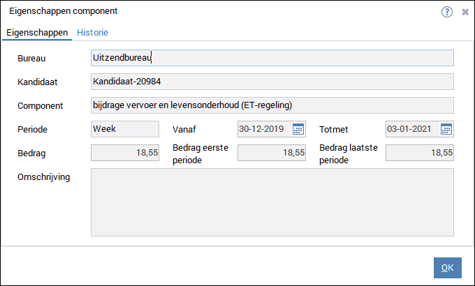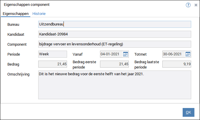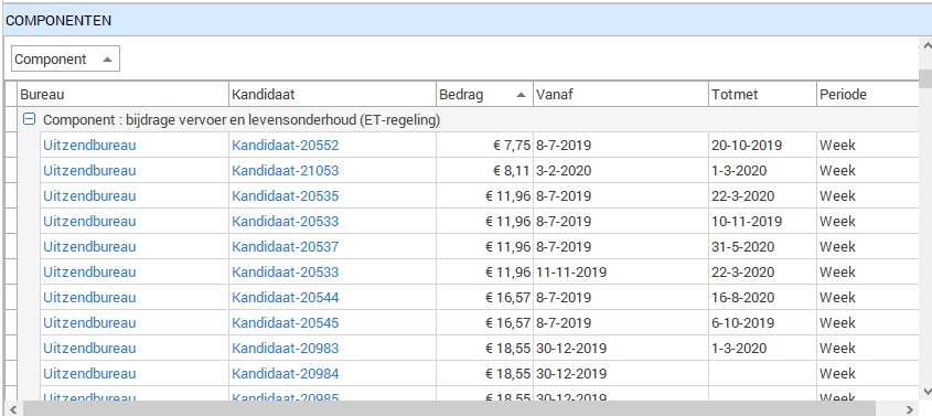 2. We gaan het component ‘bijdrage vervoer en levensonderhoud (ET-regeling)’ wijzigen bij hetzelfde bureau voor de kandidaten die een KandidaatComponent hebben met het bedrag € 18,55. Deze laten we ingaan op 04-01-2021 en laten gelden tot 30-06-2021.