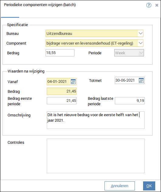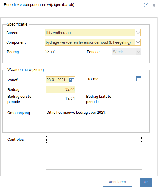 De afgesloten KandidaatComponenten hebben de einddatum 03-01-2021 gekregen en de nieuwe KandidaatComponenten starten met het nieuwe bedrag op de aangeven datum.