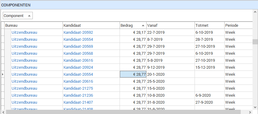 Bij de afgesloten KandidaatComponenten is tijdens de verwerking het bedrag voor de laatste periode berekend en ingevuld. De laatste dag is een woensdag, dus het bedrag wordt berekend over 3 dagen (28,77 / 7 * 3) .