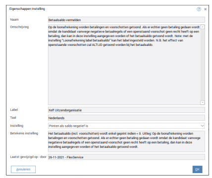 Bij deze kandidaat is een voorschot van 450 euro gegeven op het loon, maar uiteindelijk heeft hij netto 407,24 verdiend, waardoor er geen uitbetaling was. Enkel een verrekening. Het resterende negatieve saldo wordt nu netjes getoond. De instelling om dit aan te zetten op de loonafrekeningen zit in de Administrator – Instellingen – Modules FlexService – Verloning – Loonafrekening, tab Instelling. De