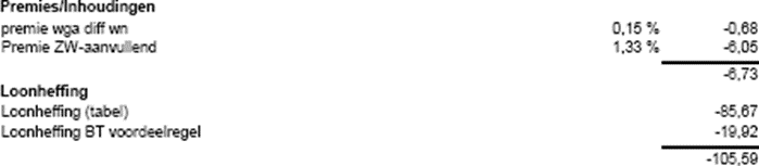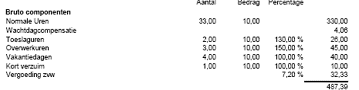Het aantal uren dat op onregelmatige tijden is gewerkt met het bijbehorende toeslagpercentage. Het bedrag is het loon dat bij de ‘normale uren’ hoort.