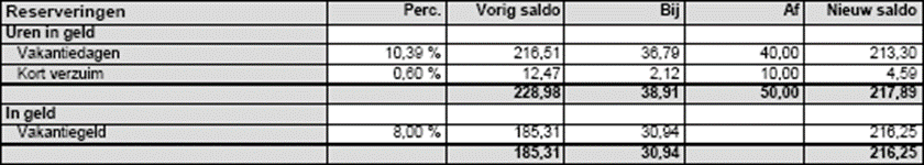 Er wordt 10,39% van het loon opgebouwd aan vakantiedagen. Het vorige saldo is het saldo dat op de vorige loonstrook stond, daarna komt het bedrag dat er deze periode bij is gekomen. In dit voorbeeld zijn er ook vakantiedagen opgenomen en daarom is de kolom ‘Af’ gevuld. Het nieuwe saldo (in euro’s) staat in de laatste kolom. Worden de reserveringen in uren (‘uren in tijd’) opgebouwd, dan staan er geen bedragen maar (delen van) uren in de kolommen vermeld.
