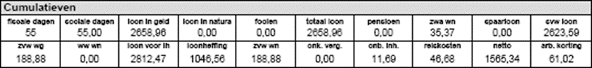 Als er vakantiedagen, vakantiegeld, feestdagen, kort verzuim/bijzonder verlof is uitbetaald, dan staat dat hier vermeld met het bijbehorende aantal en uurloon