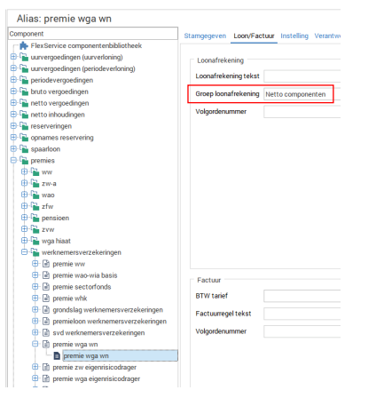 Op zich is het een keuze waar je de premie wga wn toont. Het is een netto inhouding op het loon, maar tegelijk is het ook een premie. Gelukkig is de plaats op de loonafrekening eenvoudig instelbaar, zodat je het naar eigen wens in kunt regelen. De instelling waar de wga wn getoond wordt, zit in module Component, tab Loon/factuur, in het veld “Groep loonafrekening”. Die staat standaard op “Netto componenten”.