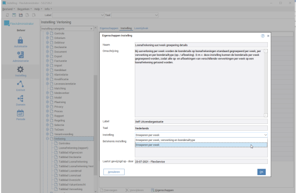 De instelling in de FlexAdministrator > Instelling > Modules FlexService > Verloning, tab Instelling 'Loonafrekening uur/week groepering details' kan worden gezet op: