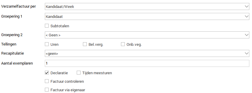 Deze instelling regelt wat er allemaal onder 1 factuurnummer terecht komt. Stel, je wil dat alle uren van een bepaalde week op 1 factuur terecht komen, dan stel je bovenstaande in; per Week. Stel, je wil dat voor iedere kandidaat een aparte factuur gemaakt wordt, dan stel je bij de verzamelfactuur per Kandidaat in. Of als de klant verschillende kostenplaatsen heeft, en per kostenplaats een factuur wil ontvangen, dan stel je bij de Verzamelfactuur per Kostenplaats in. Er zijn ook "per" combinaties mogelijk bij de Verzamelfactuur. Als bijvoorbeeld een kandidaat eens per maand de uren aanlevert, maar de klant wil een factuur ontvangen per kandidaat, per week, dan stel je bovenstaande in: Kandidaat/Week. Door deze instelling kun je alle declaraties van de hele maand die in een keer aangeleverd zijn tegelijk verwerken, maar de software zal dit nu automatisch uitsplitsen naar een factuur per week per kandidaat.