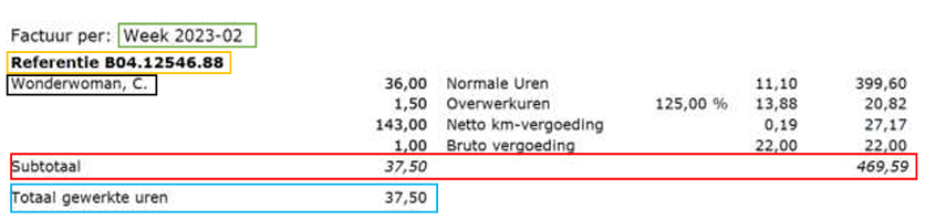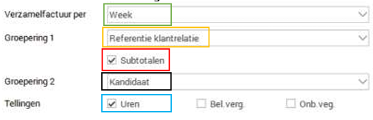 Wil de klant enkel de naam van de kandidaat zien? Zorg dan dat in Groepering 1, Kandidaat staat. Wil de klant de kostenplaats zien, met daarbinnen de kandidaten die op die kostenplaats gewerkt hebben? Zet dan op Groepering 1 Kostenplaats en op Groepering 2 Kandidaat. Bij de overheid of bij grote projecten komt het regelmatig voor dat bij de inhuur van een bepaalde kandidaat een opdrachtnummer uitgegeven wordt voor dat project. Dat nummer moet dan op iedere factuur vermeld worden, tezamen met de naam van de kandidaat. In dat geval stel je bij Groepering 1 de Opdrachtreferentie in, met in Groepering 2 de Kandidaat.