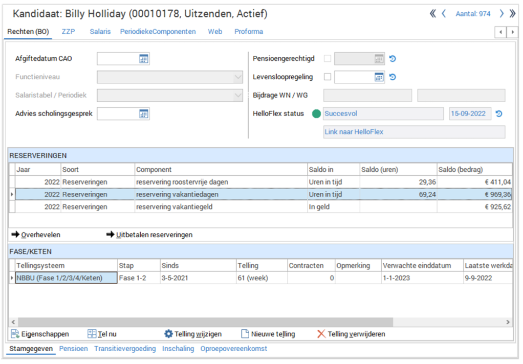 Bij een kandidaat staat een saldo van de reserveringen in uren en in geld. Wanneer het uurloon van de kandidaat wijzigt, kan het gebeuren dat het saldo in uren toeneemt terwijl de waarde in geld daalt. Hierbij een voorbeeld: