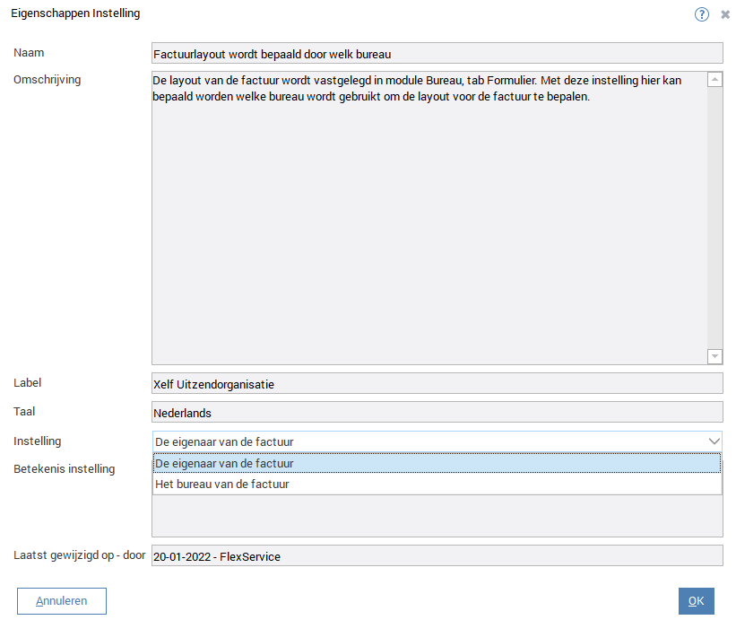 Als in deze instelling staat “De eigenaar van de factuur” dan wordt gekeken naar de eigenaar van de Klantrelatie die de factuur gaat krijgen. De klantrelatie kan dan staan op de werkmaatschappij, maar ook op de vestiging. Dus op die manier kan per vestiging een afwijkende lay-out ingericht worden, die gevolgd wordt afhankelijk van de eigenaar van de Klantrelatie.