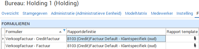In module Bureau, tab Formulier zit een groot aantal situaties vermeld waarin een rapport lay-out gekozen kan worden. Denk aan de lay-out die gebruikt moet worden bij het printen van ziektemeldingen, de lay-out die gebruikt moet worden voor loonafrekeningen, voor verantwoording overzichten etc. En dus ook de lay-out die gebruikt moet worden voor verkoopfacturen.