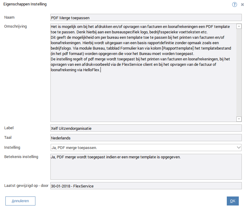 Voor wat uitgebreidere grafische elementen, of als de kwaliteit van de grafische elementen wat hoger moet zijn kan het briefpapier in PDF op A4 formaat gekoppeld worden bij “Rapport template”. Daarbij moet de instelling in de Administrator, Instellingen, Modules FlexService, Rapport, tab Instelling, PDF merge toepassen, op Ja staan.