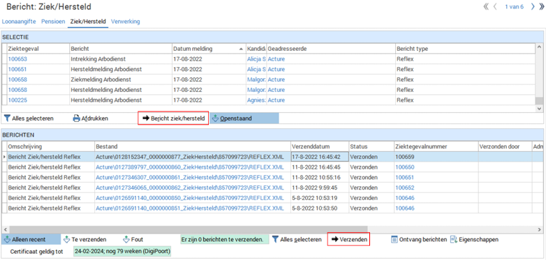 Het bericht wordt daarna verzonden met de knop “Verzenden”, onderin het scherm. Als het bericht correct ontvangen is door Acture verspringt de status naar Verzonden.