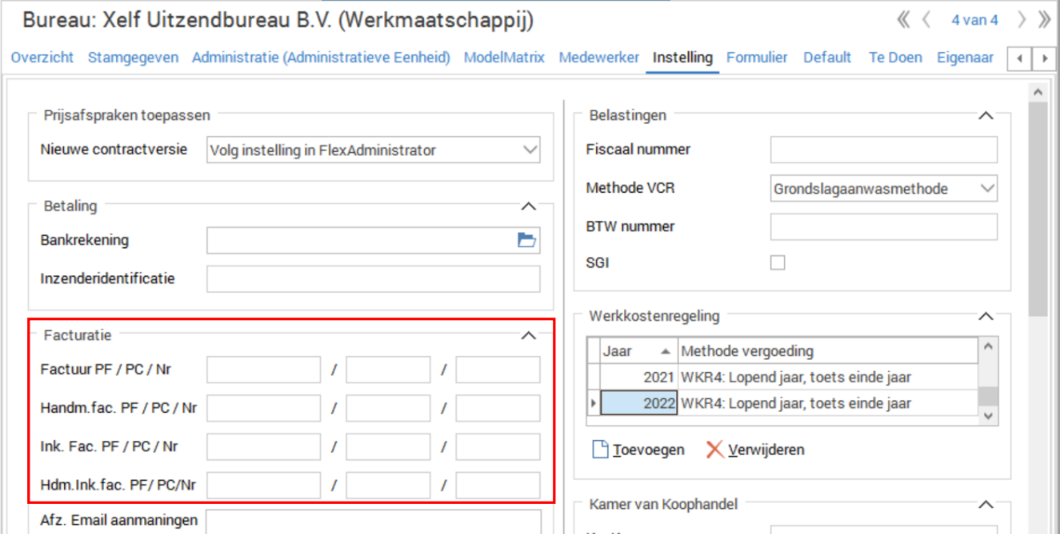 Dan zijn er nog de velden voor de (handmatige) inkoopfacturen. Deze zullen gebruikt worden op het moment dat je gebruik maakt van z.g. Reversed Billing, waarbij je naar ZZP’ers of bureaus waarbij je Inleen-Doorleen toepast de factuur stuurt die zij normaliter zouden sturen. In FlexService/HelloFlex is er de mogelijkheid om inkoopfacturen te maken op basis van de ingevulde uren van de ZZP’ers of inleen bureaus. Je gebruikt in dat geval het urenbriefje voor de verkoopfactuur, en in plaats van voor de loonafrekening gebruik je de uren dan voor de inkoopfactuur. Dit vergt wel een aparte inrichting, neem