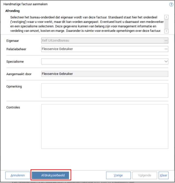 Als extra controle of je een juiste tekst hebt ingevoerd, of die tekst netjes past, en of het bureau en de eigenaar correct gekozen zijn, is het handig om even een voorbeeldfactuur te genereren voor je de factuur daadwerkelijk maakt.