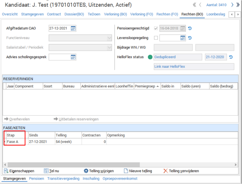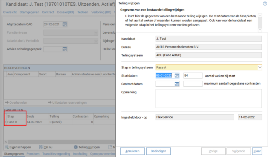 In FlexService wordt de fasetelling automatisch bijgehouden op basis van gewerkte weken (fase 1-2/fase A) danwel aantal kandidaatcontracten en -contractduur (fase 3-4/fase B-C).