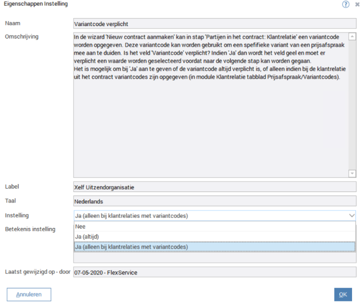 Het is mogelijk het veld van de Variantcode verplicht te maken bij het aanmaken van het contract. Deze instelling zit in de FlexService Administrator – Instellingen – Modules FlexService – Contract – Actie Nieuw.