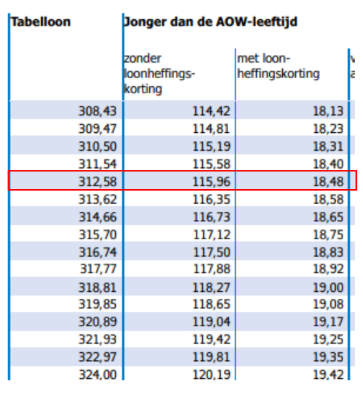 Loontijdvak: Voor het bepalen van de hoogte van de loonheffing heeft de Belastingdienst tabellen gemaakt. Er zijn tabellen voor onder andere week, vierweken en maand. Deze tabellen worden ook in FlexService toegepast bij de verloning. In de tabel van de belastingdienst kun je aflezen wat de loonheffing moet zijn bij een bepaald loon. Hieronder als voorbeeld van zo’n tabel, in dit geval de tabel voor de weekverloning. Stel dat de kandidaat € 312,58 verdient, dan moet er € 115,96 worden