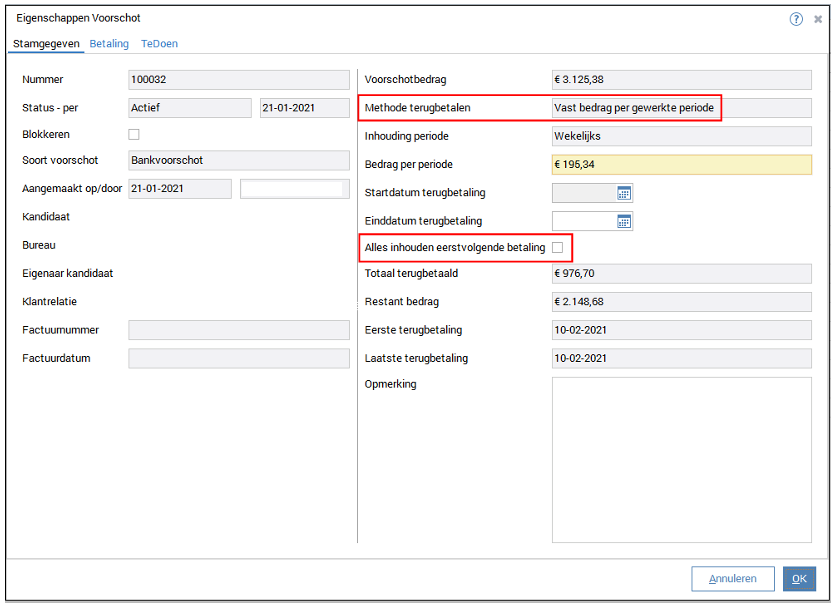 Als een kandidaat uit dienst gaat terwijl er nog voorschotten open staan is het verstandig te controleren op welke manier het voorschot verrekend wordt. Als er is ingesteld dat terugbetaald wordt via een methode die anders is dan inhouding ineens, zal er moeten worden ingegrepen. Via de vink “Alles inhouden eerstvolgende betaling” zorg je er voor dat geprobeerd wordt om het volledige bedrag met de eindafrekening te verrekenen. Dit lukt uiteraard enkel als het netto loon gelijk of hoger is aan het openstaande voorschotbedrag.
